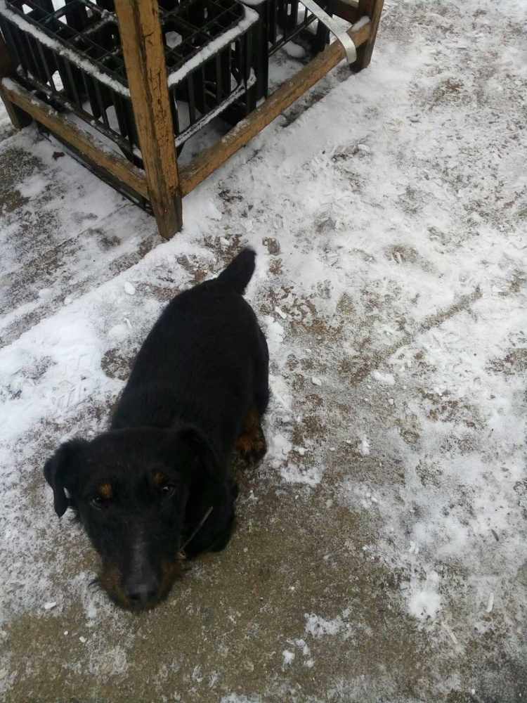 Потерялся Ягдтерьер, окрас чёрный. Рост в холке 38 см. хвост купированный. Нашедшего просим вернуть за вознаграждения. Тел: 89514621273. Мошенников просим не беспокоить.