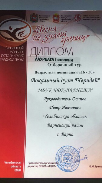 От Дворца культуры «Планета» в данном конкурсе принял участие вокальный дуэт «Черидей», который исполнил популярную композицию из «Золотого фонда» 30-80-х годов XX века - «Фантазёр» и песню военных лет «Ты ждёшь Лизавета».