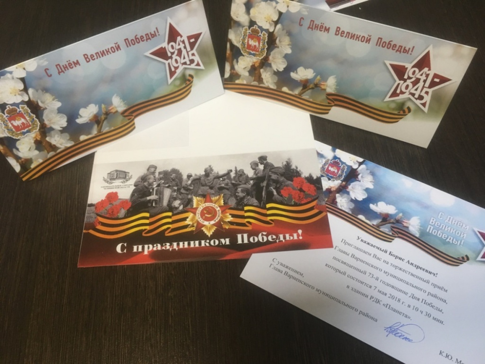 Ежегодно в преддверии празднования дня Победы в Великой Отечественной войне в Варненском муниципальном районе проводится прием Главы района ветеранов, тружеников тыла и жителей блокадного Ленинграда. В этом году торжественное мероприятие состоялось 7 мая в районном Дворце культуры «Планета». В настоящее время на территории Варненского муниципального района проживает 9 ветеранов ВОВ более 170 тружеников тыла, 4 несовершеннолетних узника фашистских лагерей, 2 жителя блокадного Ленинграда, 30 граждан указанных категорий были приглашены на торжественный прием Главы района. В праздничной атмосфере ветеранов поприветствовали и поздравили Глава Варненского муниципального района Моисеев К.Ю., председатель районного Собрания депутатов Лященко О.В., председатель районного Совета ветеранов Чернакова Г.Г. Творческим коллективом районного дворца культуры «Планета» был организован праздничный концерт по окончании, которого всем присутствующим ветеранам были вручены памятные подарки от Главы Варненского муниципального района Моисеева К.Ю., депутата Законодательного Собрания Челябинскойобласти Завгородней Т.А.