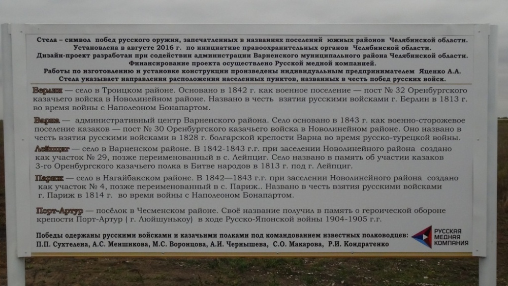 Следующим важным событием стало открытие Стелы с указателями поселений, названных в память о событиях из военной истории страны: Лейпциг, Берлин, Порт-Артур, Париж, Варна. Стела установлена по инициативе правоохранительных органов Челябинской области, дизайн-проект был разработан при содействии администрации Варненского района, финансирование проекта осуществила Русская медная компания. Стела представлена в виде верстового столба, символизирует тесную связь района с предприятием металлургической отрасли и указывает направления расположения населенных пунктов, названных в честь побед русских войск.