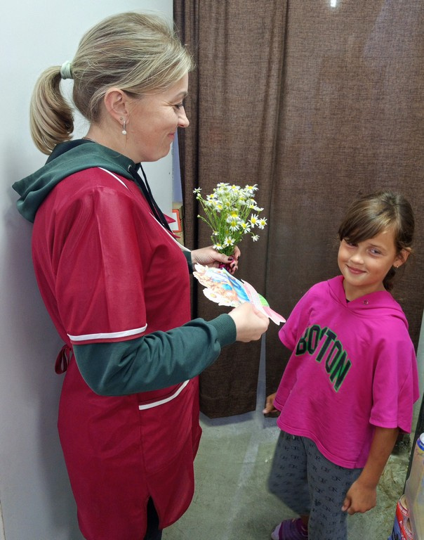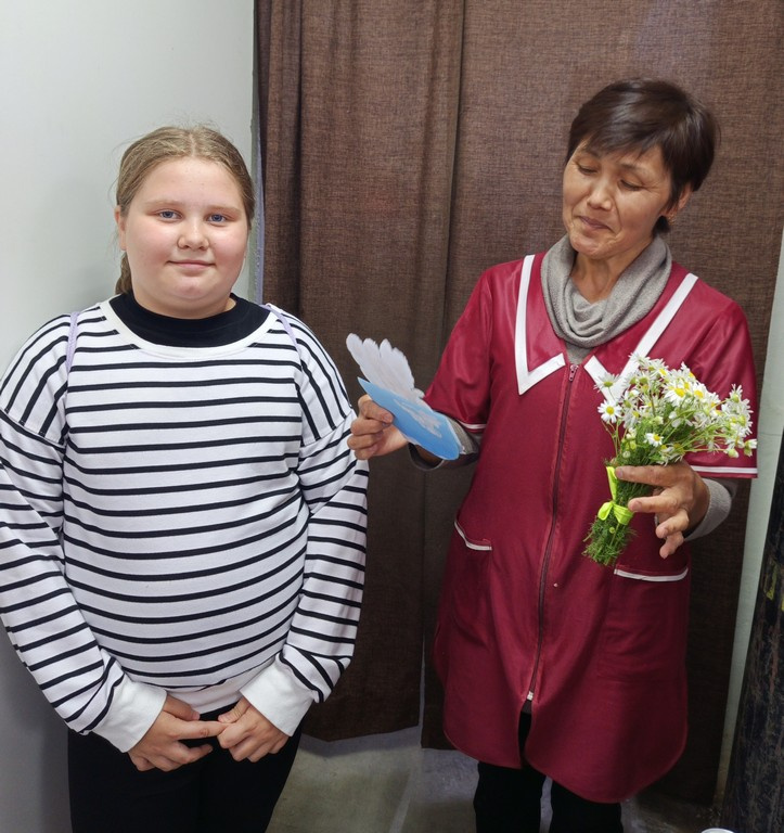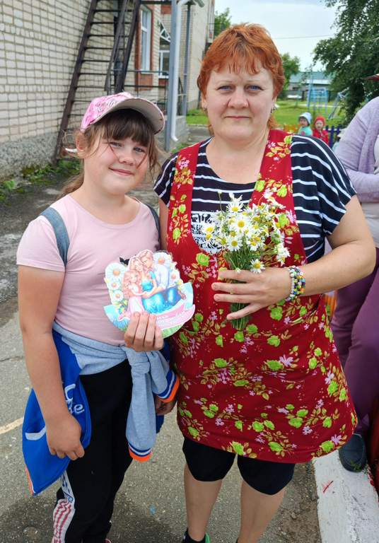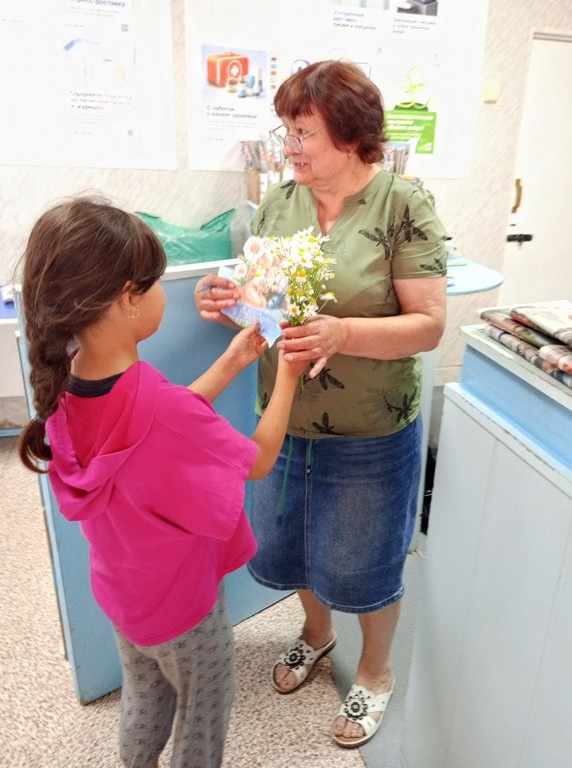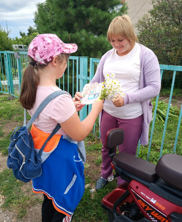 Девочки своими руками изготовили открытки и букетики из ромашек, которые дарили прохожим. Среди тех, кто получил поздравления, были продавцы, сотрудники почты и детского сада, а также жители посёлка.