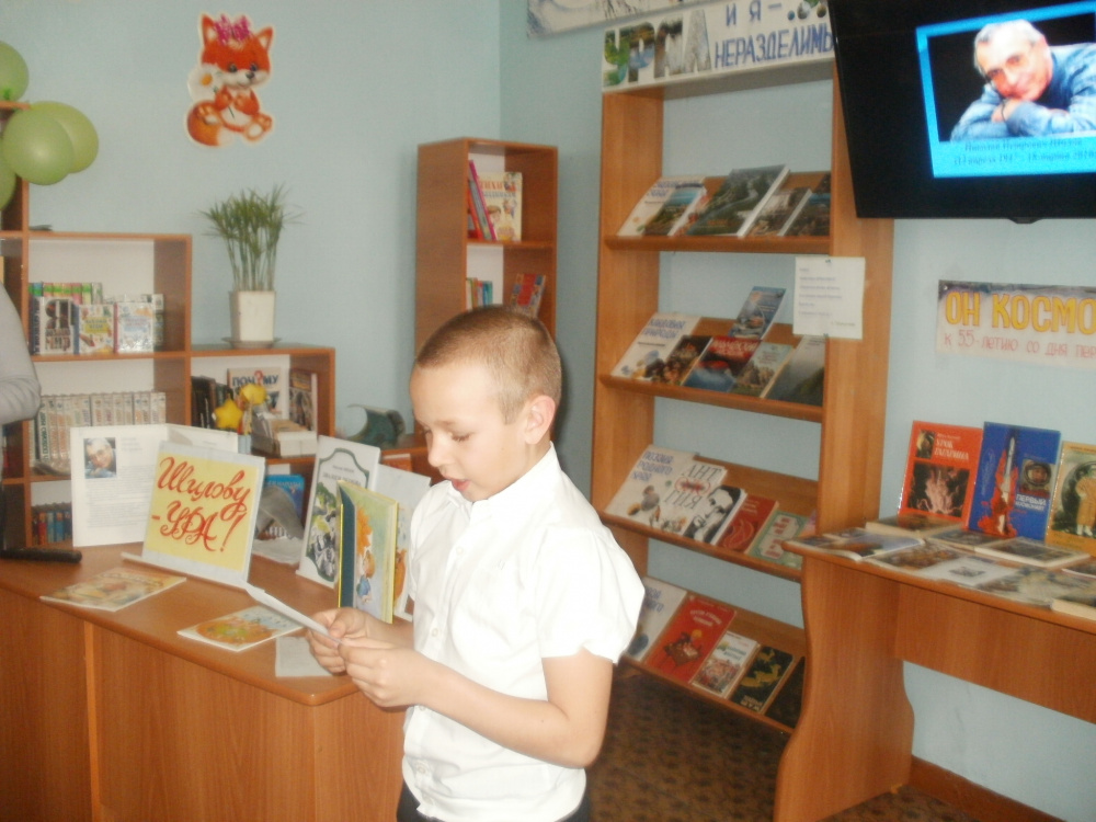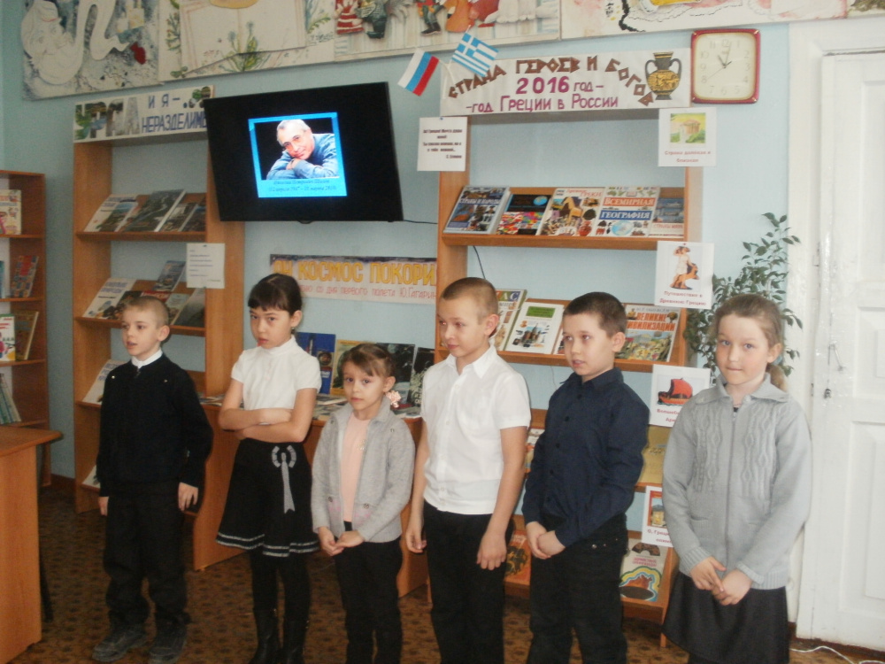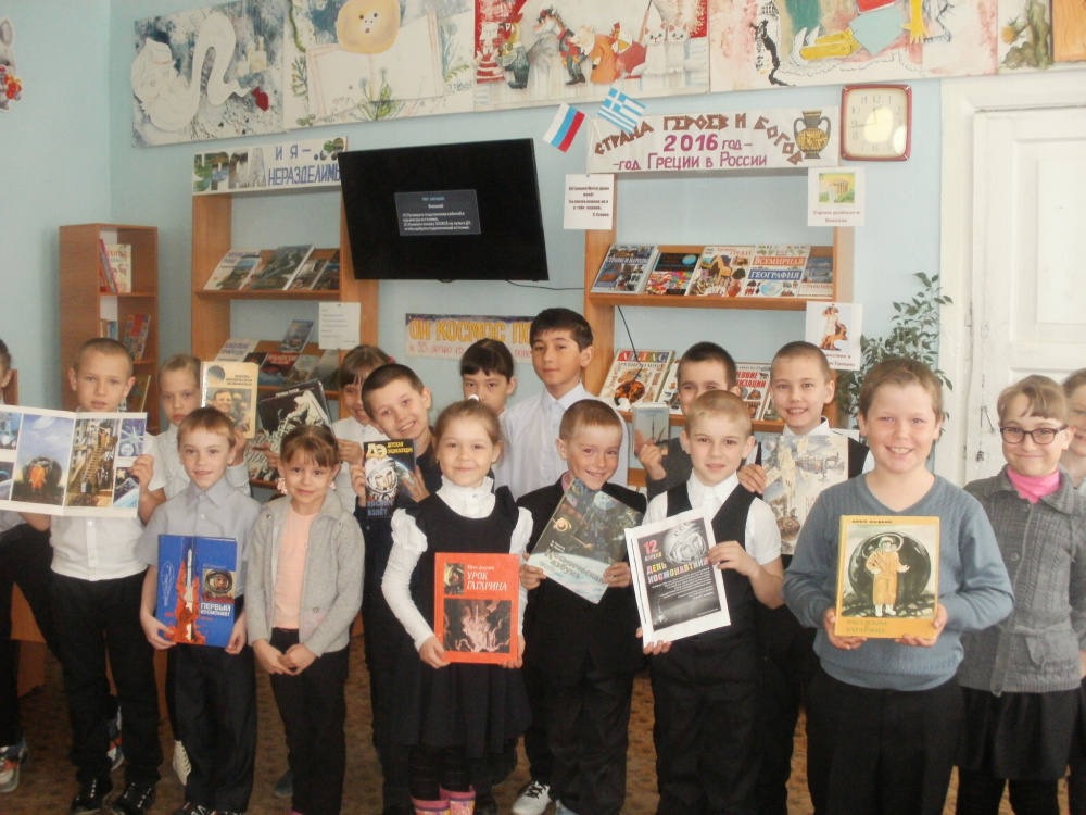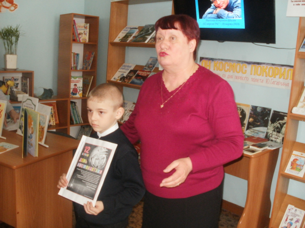 В этот же день, прошёл тематический вечер «Он космос покорил», посвящённый 55-летию со дня первого полёта Ю.Гагарина в космос. Дети узнали много интересного о жизни первого космонавта, познакомились с его книгами. Ребята рассказали о полете в космос Белки и Стрелки, показали альбом о полете Ю.Гагарина, который оформили сами, отвечали на вопросы викторины, прослушали рассказ очевидца полёта, который поделился своими впечатлениями о полете первого человека в космос.