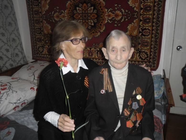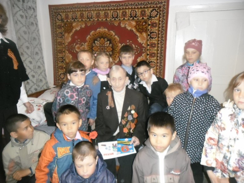 5 мая с цветами ученики побывали в гостях у Никифорова Василия Степановича. Людмила Андреевна познакомила школьников с трудолюбивым, общительным, доброжелательным и конечно уважаемым человеком нашего села. Василий Степанович в 1943 году был призван в армию, проходил обучение запасном в стрелковом полку в г. Чебаркуль Челябинской области. В марте 1945 года был направлен в Минскую область, для получения материальной части и в дальнейшем отправкой на фронт. Но участвовать в боевых действиях не пришлось, так как окончилась война. Никифоров В.С. участвовал в салюте Победы г. Минск. В этом году Василий Степанович отпраздновал 91 год рождения. Увидев учеников, ветеран прослезился и очень был тронут таким вниманием.