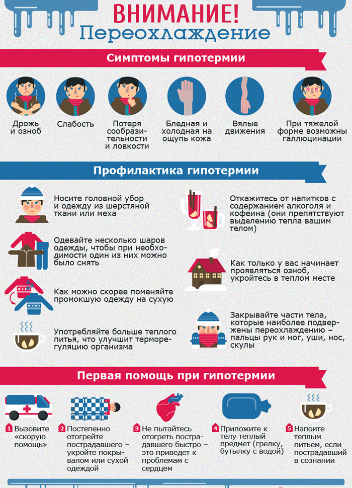 При длительном пребывании вне помещения, особенно при высокой влажности и сильном ветре, обморожение можно получить осенью и весной при температуре воздуха выше нуля. Врачи советуют в холода как можно меньше времени находиться на улице.