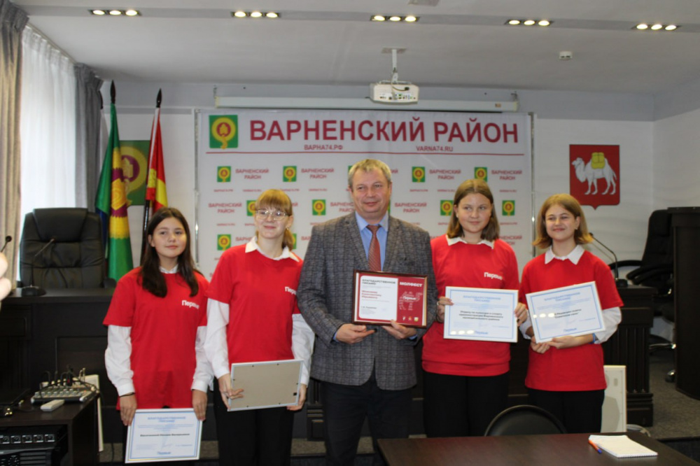 Затем активисты местного отделения «Движение Первых» вручили Благодарственное письмо Главе Варненского муниципального района Константину Моисееву, за вклад в организацию молодежного фестиваля Челябинской области "МолФЕСТ" от Светланы Буравовой, председателя регионального Общероссийского движения детей и молодёжи "Движение Первых".