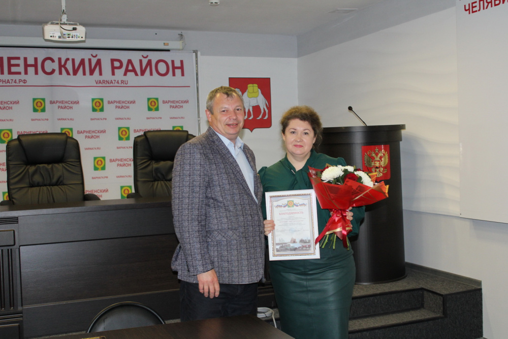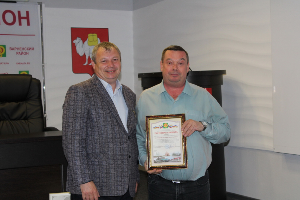 К.Ю. Моисеев от администрации Варненского муниципального района вручил Благодарность специалисту по охране труда администрации района А.А. Золотцевой за добросовестный труд, ответственность, профессионализм и в связи с юбилеем и Почетную Грамоту первому заместителю Е.А. Парфенову за многолетний добросовестный труд, ответственность, исполнительность, профессионализм, вклад в развитие органов местного самоуправления района и в связи с 55-летием со дня рождения.