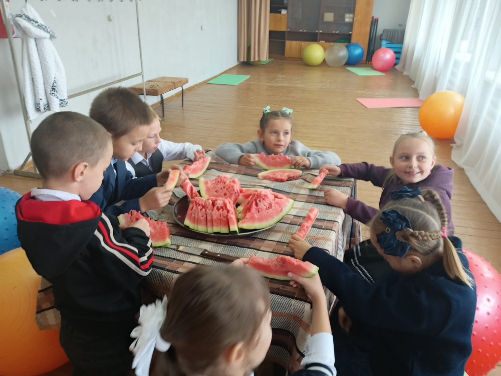 Дети отвечали на вопросы викторины, принимали участие в конкурсах и с удовольствием угощались сочным арбузом.