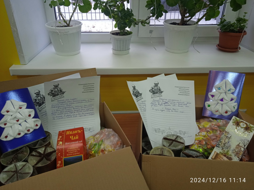 Библиотекарям было особенно приятно передать в подарок солдатам новогоднюю открытку, которую сделали на мастер-классе дети из МОУ «Центра психолого-педагогической, социальной и медицинской помощи детям Варненского района», и трогательные письма от наших постоянных маленьких читателей с надеждой о скором возвращении домой здоровыми и невредимыми. А сладкий сюрприз в посылке поднимет настроение солдатам и согреет в зимние морозные вечера.