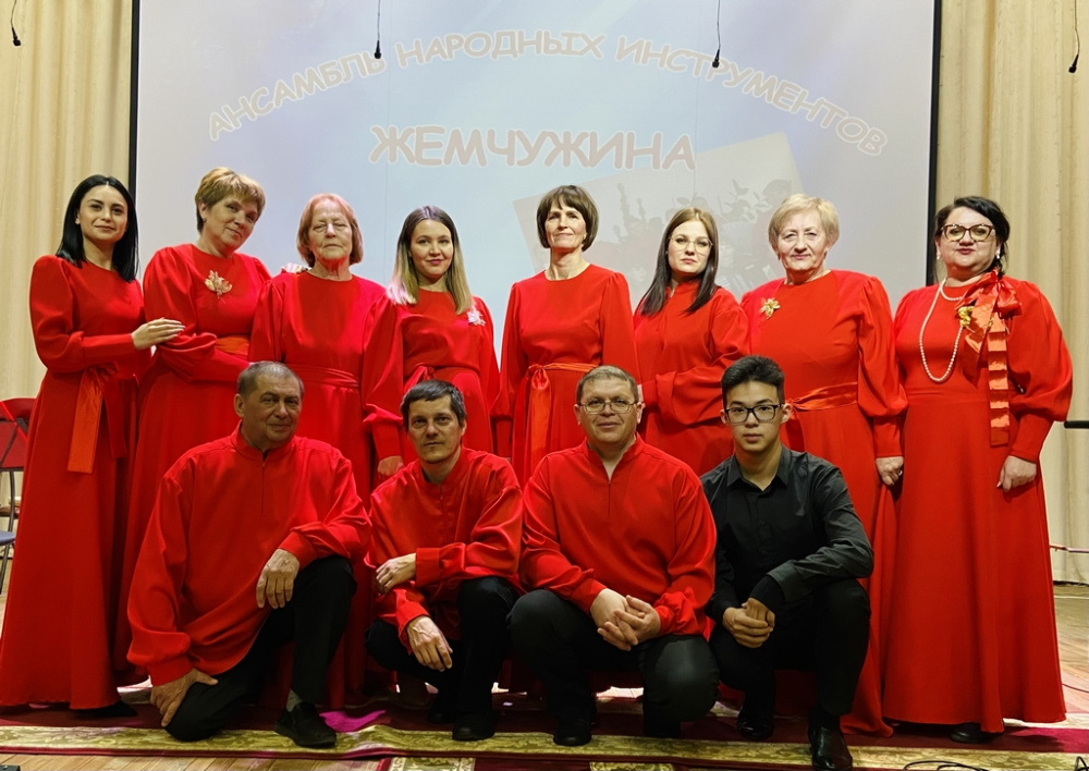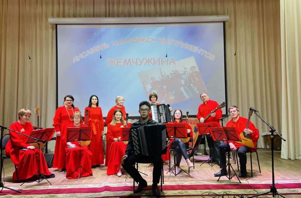 Коллектив состоит из преподавателей Детской школы искусств п. Новый Урал. Соло на балалайке прима исполняет - Александр Комлев, преподаватель по классу балалайка, гитара. Партию на бас балалайке исполняет Дмитрий Сюрук, преподаватель по классу баян. Партию баяна исполняет Александр Хижняк, концертмейстер. Партию балалайки альт, а также партию фортепиано исполняет Наталья Киржацких, преподаватель по классу фортепиано. Партию домр прима исполняют Динара Маслова, преподаватель по классу фортепиано и преподаватель театрального отделения Мария Шаблина. Партию домр альт исполняют Надежда Креслова и Лариса Сутормина преподаватели по классу теории музыки. Партию ударных инструментов и вокал исполняют Ирина Чухлиева преподаватель по хоровому классу, и Анна Студеникина преподаватель по классу хореография. Руководитель ансамбля-Марина Аксенова преподаватель по классу аккордеон, именно благодаря Марине Леонидовне, ансамбль «Жемчужина» достиг успеха в конкурсных выступлениях и имеет яркий и интересный репертуар. В концерте прозвучала песня «Русское поле» из репертуара Л.Зыкиной в исполнении Ирины Чухлиевой, а также произведения А. Петрова, И.Тамарина, Карла Дженкинса, В. Семенова, Е.Дербенко, В.Городовской, А.Шнитке, Микиса Теодаракиса, Б. Трояновского.