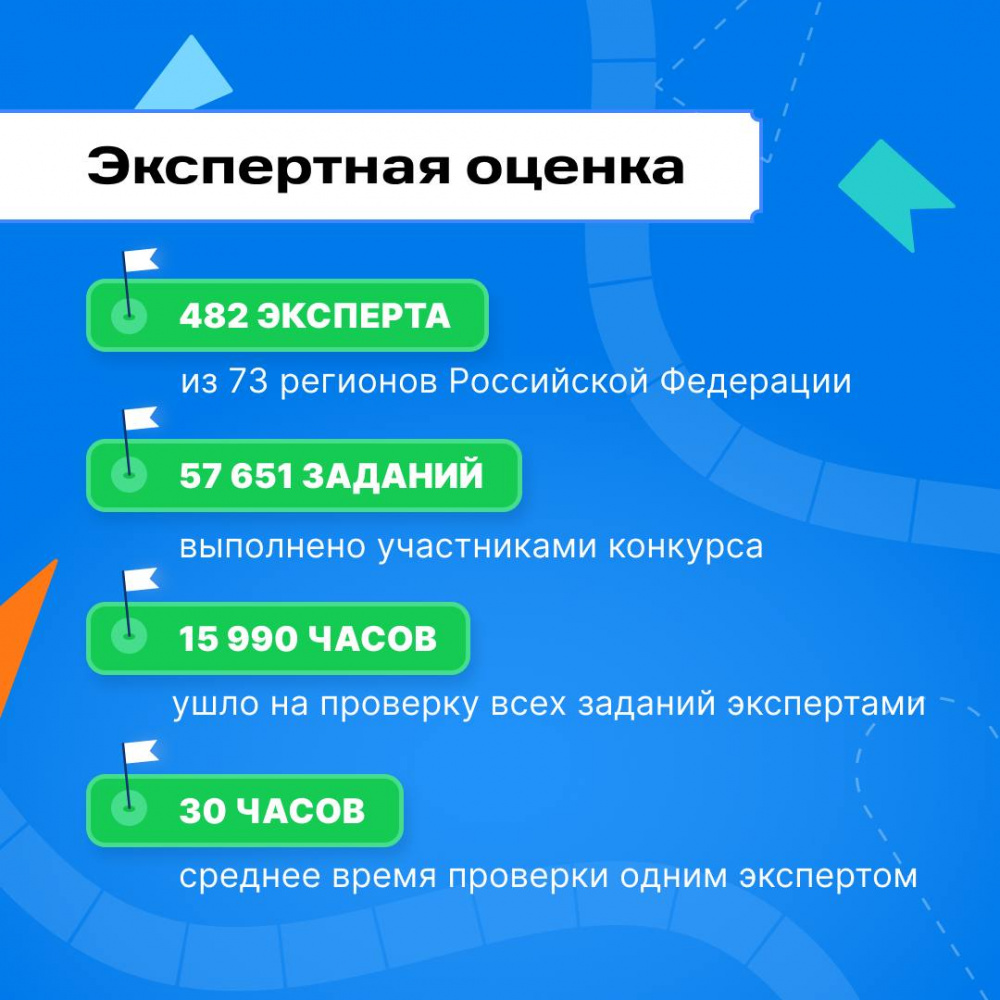 Задания о работе детских коллективов, реализации социально значимых дел и об участии во всероссийских акциях оценивал Экспертный совет конкурса, в который вошло 482 человека из 73 регионов страны. Всего они оценили более 57 тысяч заданий, а также проанализировали деятельность участников.