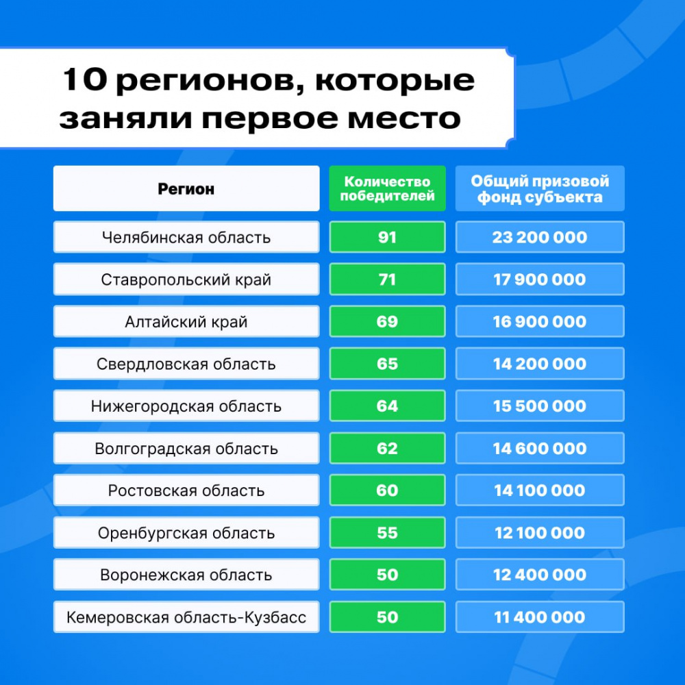 Победители, занявшие первое место, а это 150 команд, получат 500 тыс. рублей. Второе место заняли 300 команд, они получат премию в 300 тыс. рублей. Лауреаты, получившие третье место, — 1 550 команд — станут обладателями приза в 200 тыс. рублей. Более 23 млн рублей на развитие первичных отделений выиграли участники Движения Первых в Челябинской области.