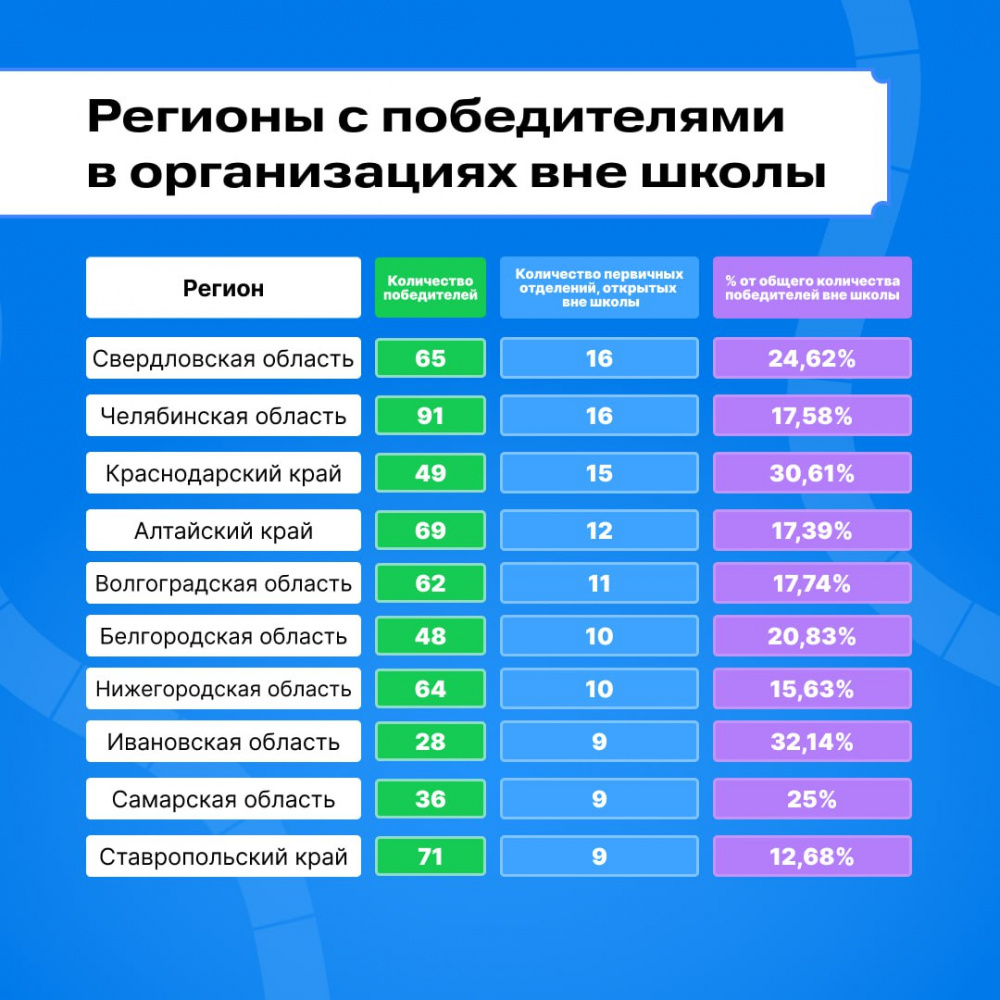 Челябинскую область на первом этапе конкурса представляло более 500 образовательных организаций со всего региона. До основного этапа конкурса после технической проверки были допущены 270 первичных отделения нашего региона. Победителями стала 91 команда, это первый результат по количеству победителей по всей России.