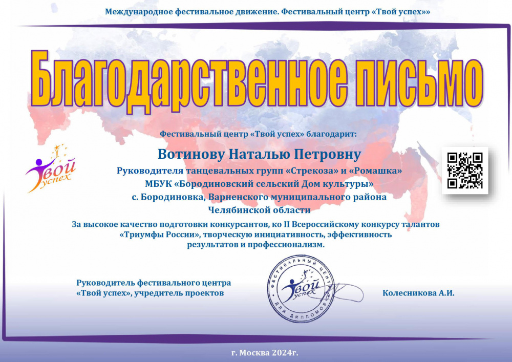 В середине июня 2024 г. танцевальные группы Бородиноского Дома культуры «Стрекоза» и «Ромашка» под руководством Натальи Вотиновой приняли участие во II Всероссийском конкурсе талантов «Триумфы России» и стали лауреатами 1 и 2 степени соответственно.
