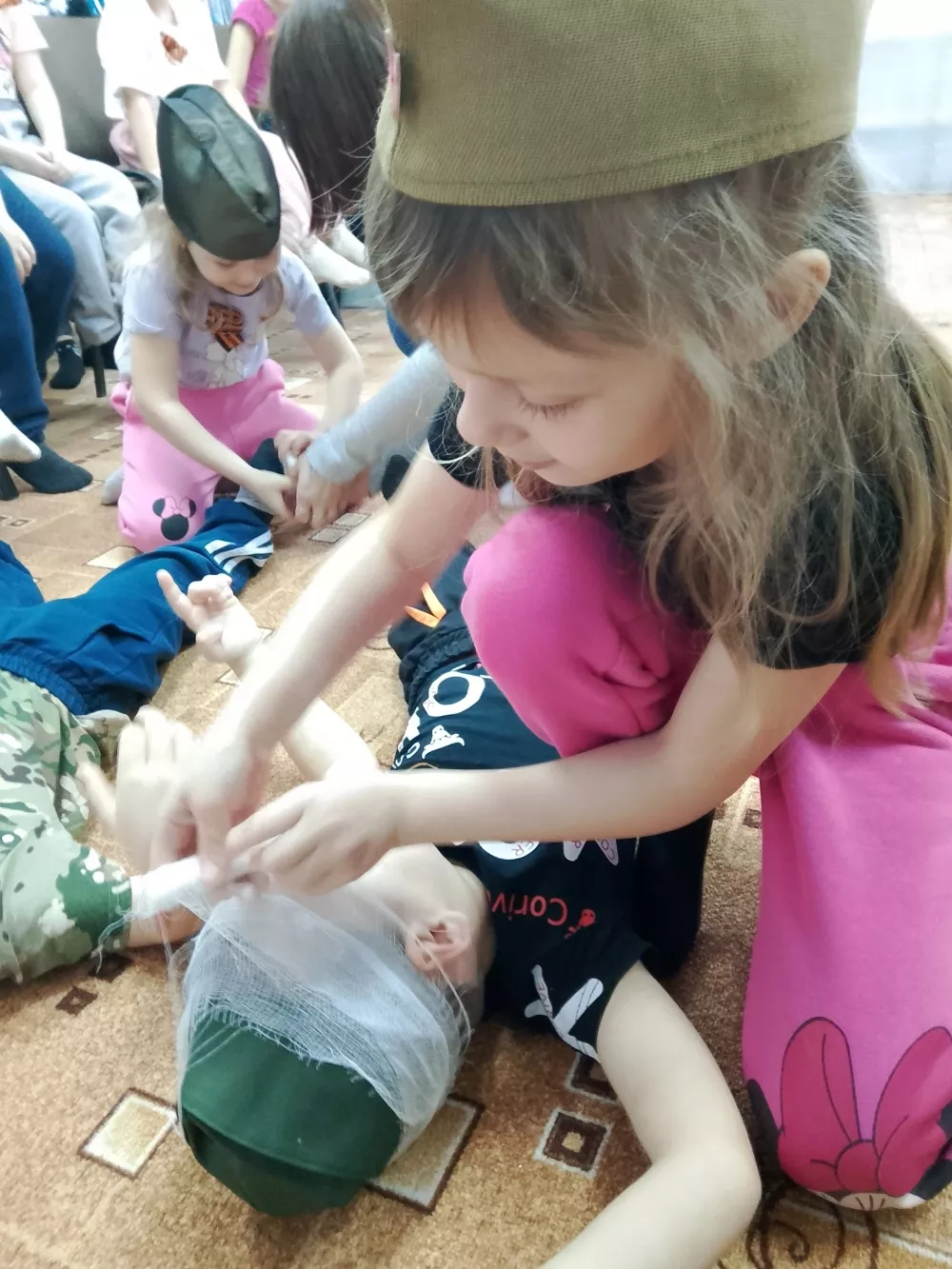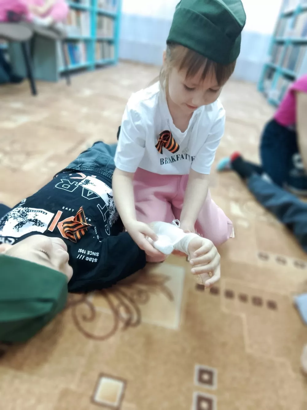 Мероприятие посетили дети из детского сада «Солнышко». С ребятками провели беседу о важных моментах нашей истории: что такое День Победы, помощь тыла, качествами солдата, Георгиевская ленточка. Поговорили о том, что на войне наравне с солдатами трудились врачи, санитары, медсестры, вытаскивая раненых бойцов с поля боя.