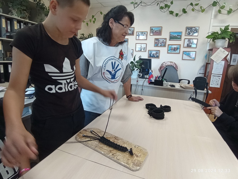 29.08.2024 г. в рамках реализации Муниципальной программы по профилактике социального сиротства и семейного неблагополучия и авторской программы «Тепло родного очага» специалистами отделения помощи семье и детям с привлечением серебряного волонтера Селиверстовой А.Ш. и волонтера центра «Дорога добра» с. Варна Дарьи Фроловой был организован мастер – класс по изготовлению «браслетов выживания» для детей из семей, состоящих на социальном сопровождении в МУ КЦСОН.