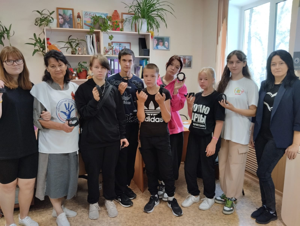 Волонтеры просто и доступно объяснили ребятам весь процесс плетения браслета, выдали нужный для изготовления материал, и ребята, прислушиваясь к советам, приступили к изготовлению. Хоть было и непросто, но ребята активно вовлеклись в процесс изготовления, справились с этим нелегким заданием. Все ребята очень старались, были терпеливы, внимательны и аккуратны!