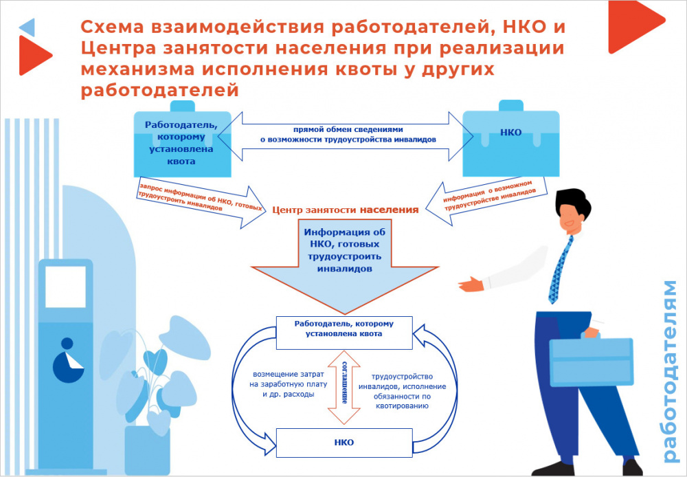Так если работодатель не имеет возможности принять к себе на работу человека с инвалидностью, то он может заключить соглашение с иным работодателем на трудоустройство инвалидов. Работодатели могут обратиться в Центр занятости населения за информацией о предложении и спросе на трудоустройство инвалидов в счёт квоты от иных работодателей или напрямую обмениваться этой информацией и заключать соглашения.