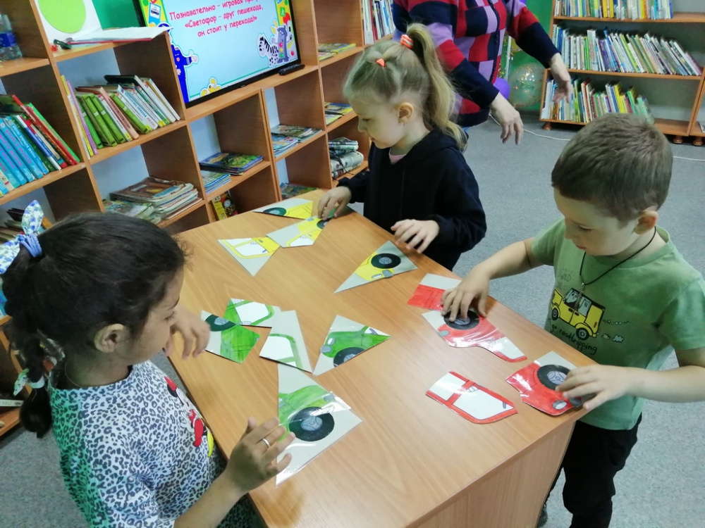 Библиотекарь предложила выполнить задания на знание правил дорожного движения. Для этого дети разделились на две команды: «Светофор» и «Зебра». В первом конкурсе участники с помощью воздушных шаров собирали светофор. В игре для капитанов «Авторомашка» команды активно отвечали на вопросы. Ребята также приняли участие в других конкурсах, играх, отгадывали загадки о правилах дорожного движения, собирали пазлы «Дорожные знаки», особенно понравился конкурс «Кто быстрее», в котором нужно было машине проехать змейкой и не сбить кегли. Все водители были старательны и аккуратны. Заключительным этапом состязаний - была викторина «Знатоки ПДД», с которой ребята отлично справились.