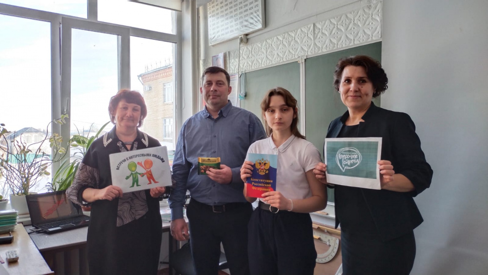 Андрей Викторович ответил на вопросы аудитории о том, как проходит подсчет бюллетеней, о погашении неиспользованных избирательных бюллетеней и т.д. В качестве наглядного пособия были показаны макеты бюллетеней прошедших муниципальных выборов и их увеличенная форма для работы в ТИКе. Лучшей ученице, Поздеевой Арине, была вручена Конституции Российской Федерации – основной закон нашего государства!
