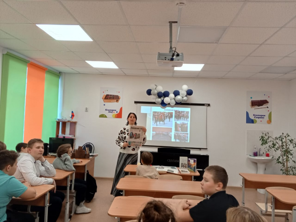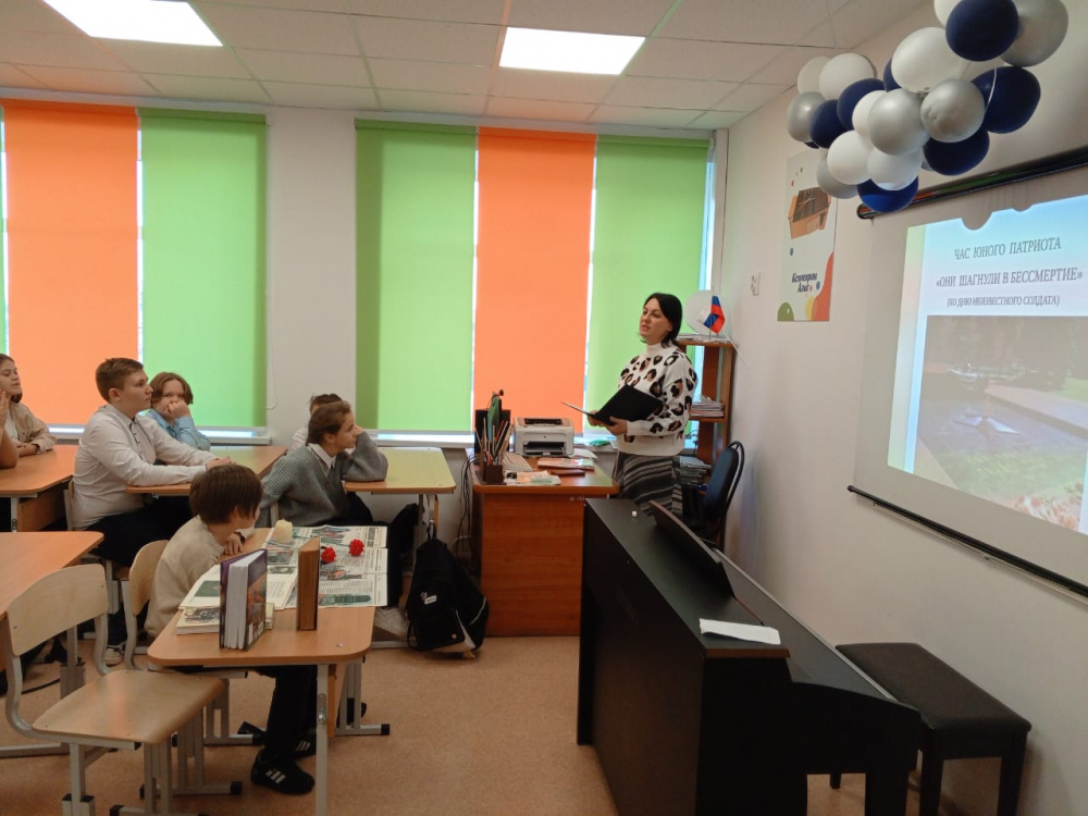 Библиотекарь рассказала учащимся о мемориале «Могила Неизвестного Солдата», установленного в Москве, в Александровском саду. Школьникам были представлены материалы из местной газеты «Советское село», освещающие события к этой памятной дате, художественные произведения о военном времени, безымянных героях, фотографии Мемориального комплекса «Могила Неизвестного Солдата».