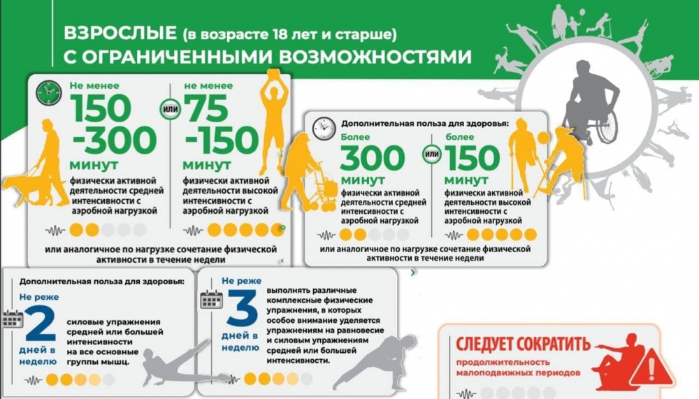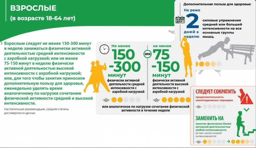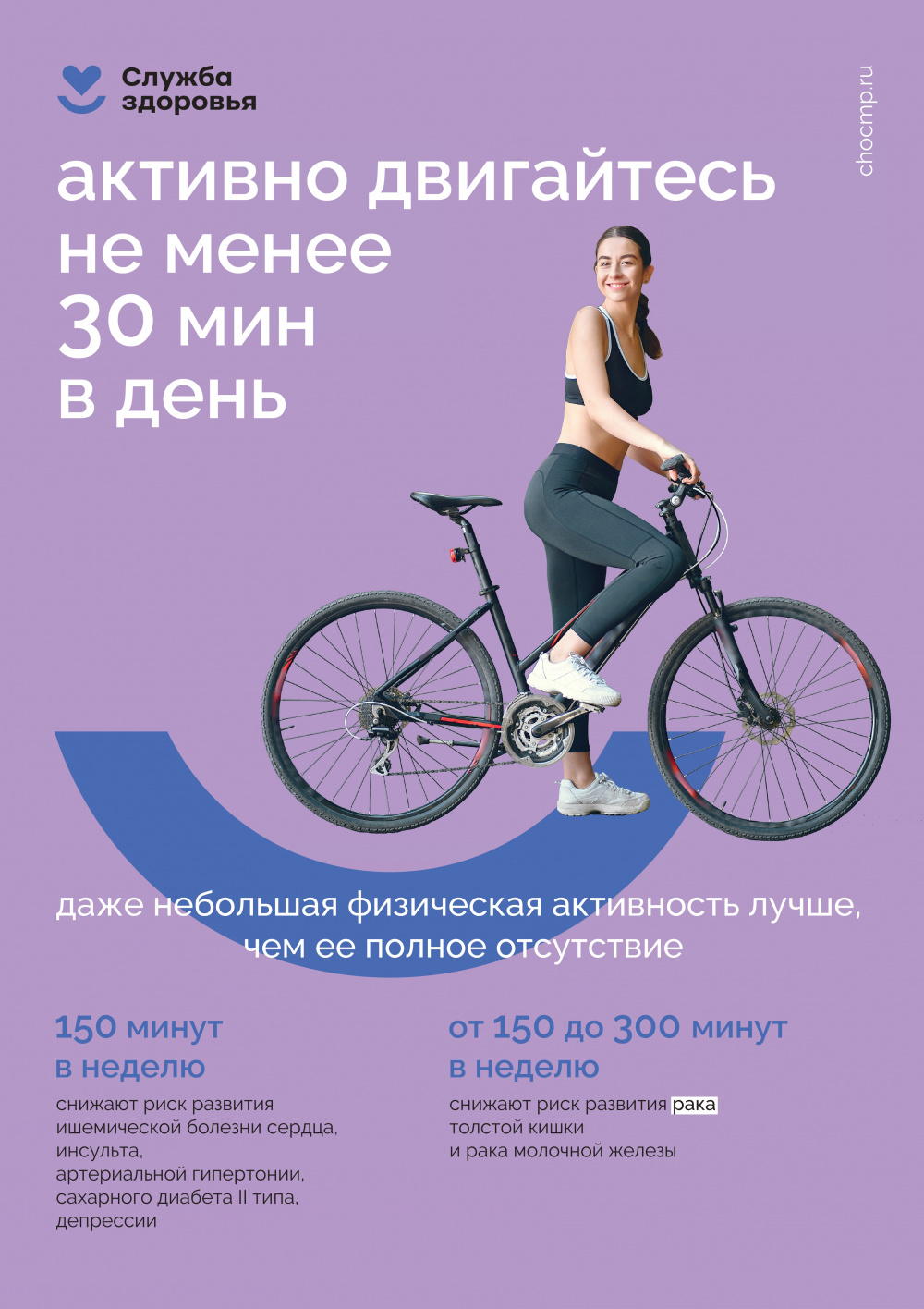 «Движение - это важный компонент здорового образа жизни. И для любого человека есть возможность выбрать свой вид любимой физической активности - это может быть плаванье и танцы, бег, лечебная гимнастика, катание на коньках им велосипеде. Главное, чтобы движение стало вашим постоянным спутником и приносило удовольствие. Всемирная организация здравоохранения рекомендует 150 минут умеренной физической активности или 75 минут интенсивной физической активности в неделю.
