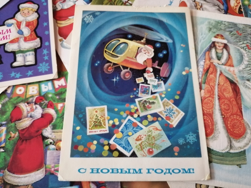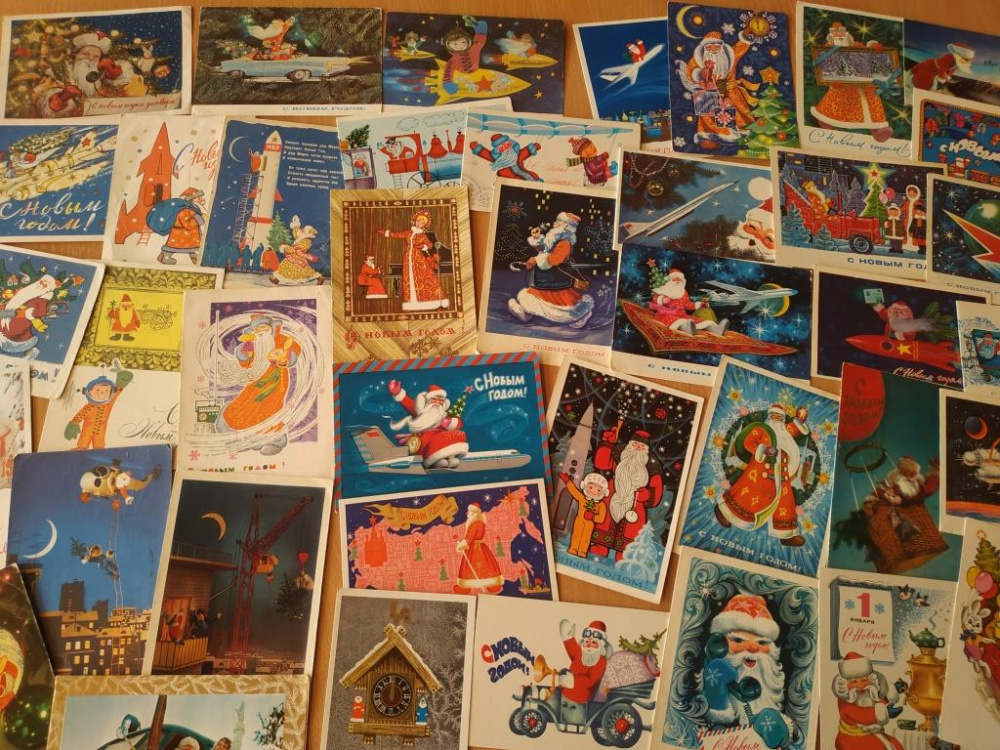 По новогодним открыткам можно изучать эволюцию транспортных средств главного зимнего волшебника. На смену оленям и лошадям пришли автомобили, вертолёты и самолёты. А с началом активного освоения космоса Дед Мороз и вовсе пересел на космические ракеты.