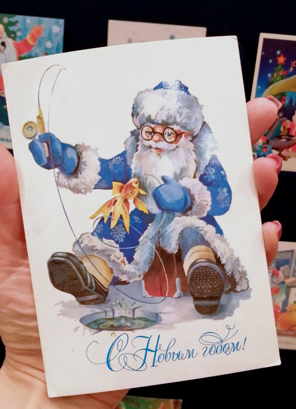Рассматривая открытки, посетители выставки смогут узнать и о его хобби. Оказывается, Дед Мороз — страстный рыбак, любитель хоккея и меломан. Ещё одно увлечение любимца детворы — управление транспортными средствами. Дед Мороз сам, без помощников, управляет тройкой лошадей, автомобилями и поездами, пилотирует космические аппараты. А по вечерам в компании Снегурочки любит пить чай из самовара.