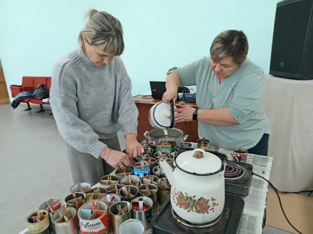 В Краснооктябрьском ДК 7 ноября 2024г. прошёл мастер-класс по изготовлению окопных свечей для бойцов спецоперации. Такая свеча горит около 5-7 часов, у свечи можно погреться, подсушить обувь, подогреть еду, вскипятить воду. Мы надеемся, что свечи, изготовлены жителями Красного Октября с душевным теплом и добротой, согреют каждого нашего солдата!