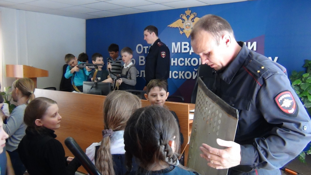 Инспектор направления профессиональной подготовки лейтенант внутренней службы Алексей Катрюк продемонстрировал образцы вооружения и специальных средств, состоящие в полиции: бронежилет, защитный шлем, пистолет Макарова, автомат Калашникова. Каждому из ребят представилась возможность не только рассмотреть спецсредства, но и подержать их в руках, примерить на себе бронежилет и каску, что вызвало у детей массу эмоций. Причём боевой экипировкой интересовались не только мальчики, но и девочки.