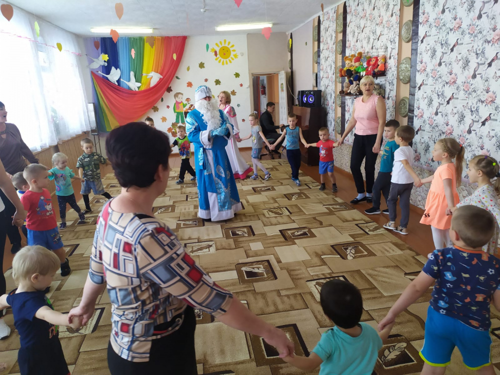 Ребята с Дедушкой Морозом играли в «Новогодний паровозик», который останавливался на «весёлых станциях», где детки пели, шумели и плясали. Играли в «Снежок», гуляли в лесу со зверятами и любимую игру Деда Мороза «Заморожу».