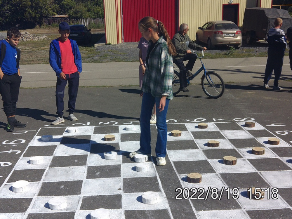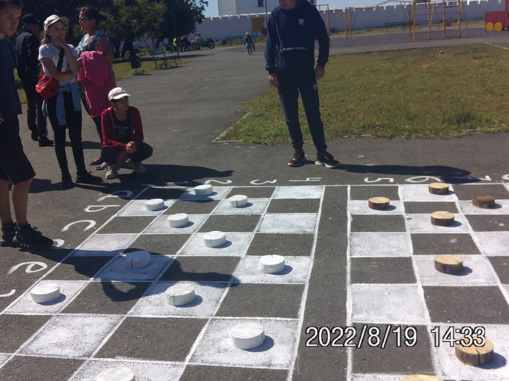 Мы долго думали, чем бы интересным занять ребят и решили нарисовать напольные шашки. Получилось очень интересно и увлекательно. Игрой заинтересовались и молодёжь, и взрослые люди. В трудной борьбе определились победители, которые во время концерта были отмечены и награждены.