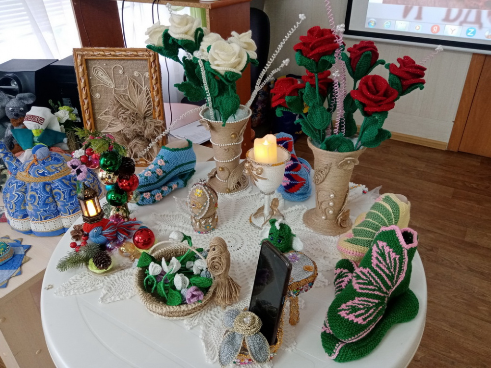В гостях клуба побывала в этот день Турсунбаева Рузалия Абдулловна, которая поделилась с участниками клуба своим мастерством, своими чудесными изделиями. Каждое изделие – это шедевр. Здесь и вещи, связанные спицами и крючком, и панно, и изделия из мешковины и джута, из бельевых веревок, из ватных палочек. В своих работах Рузалия Абдулловна использует различные материалы и техники.