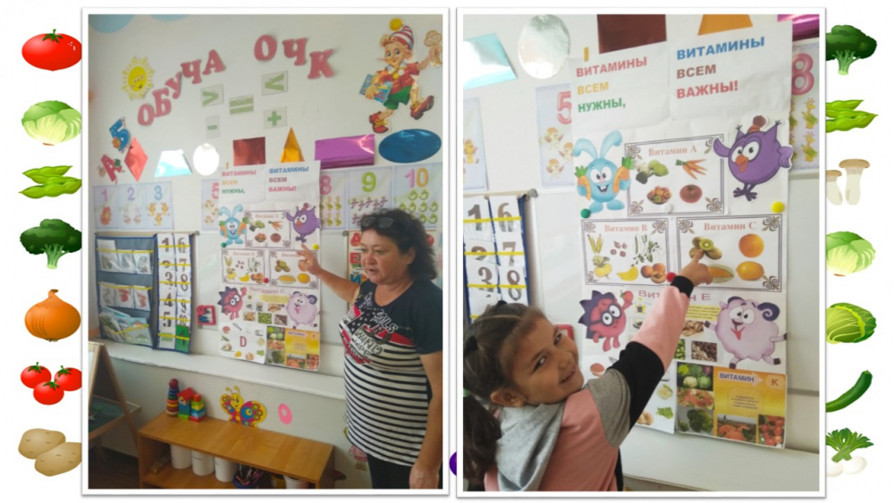 Лето – это сезон витаминов. Поэтому очень важно ещё раз напомнить детям о пользе овощей, ягод, фруктов для нашего здоровья, продолжать формировать привычку к здоровому образу жизни. Все организуемые виды деятельности были связаны одной сюжетной линией: «Витамины и их польза для нашего здоровья». Ребята участвовали в викторине, называя продукты, овощи и фрукты, в которых содержались ВИТАМИНЫ: A, D, E, C, B, K. Закрепили знания участием в дидактические и настольные игры «Чудесный мешочек», «Что растёт в саду?», «Назови какой это сок», «Узнай на ощупь», «Угадай на вкус», «Сосчитаем фрукты».