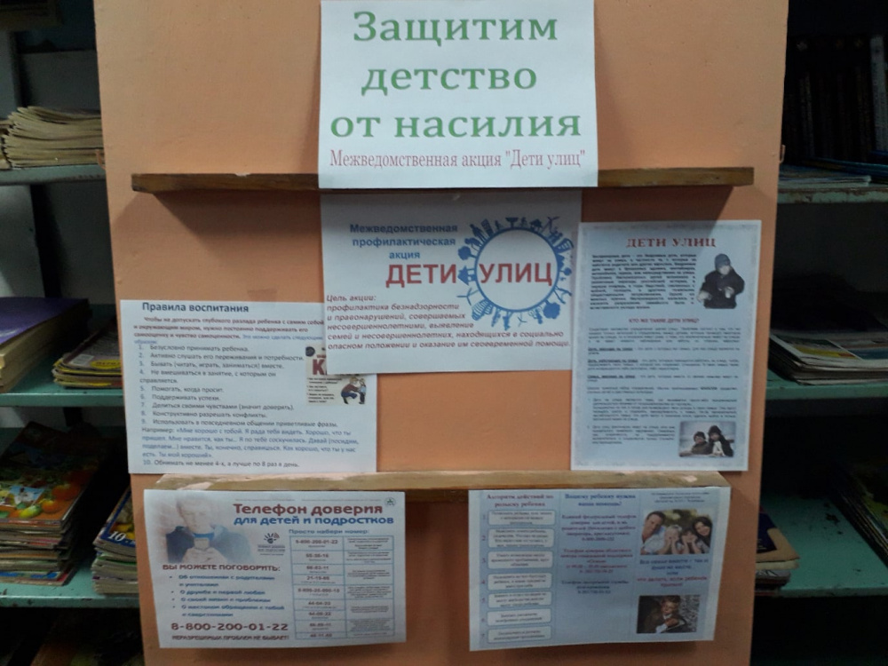 Лейпцигская Павленковская сельская библиотека участвует в Межведомственной акции "Дети улиц" которая проходит с 1 по 28 февраля. Оформлен стенд "Защитим детство от насилия" с телефонами доверия экстренных служб психологической помощи, проводятся индивидуальные и групповые беседы с подростками и детьми.
