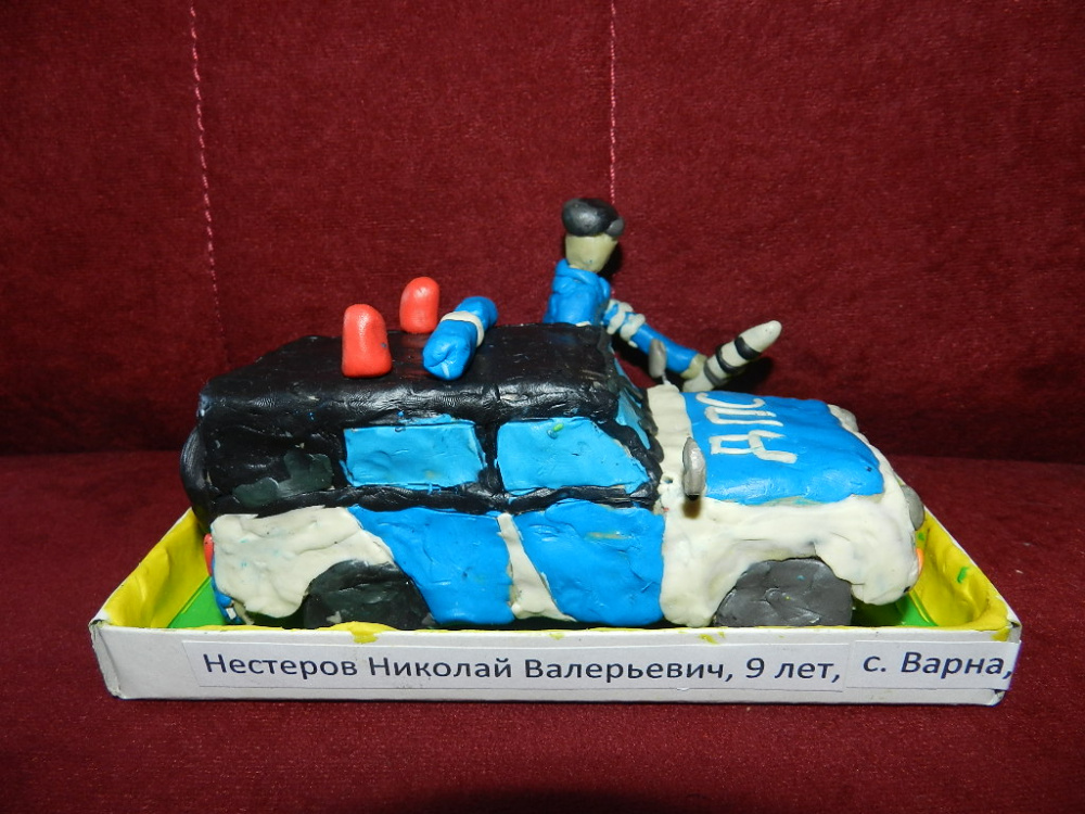 В областном конкурсе принял участие и 9-летний житель нашего села Нестеров Коля. Его работа из пластилина «На посту», с образом машины ДПС и инспектора ГИБДД направлена в ГУ МВД России по Челябинской области