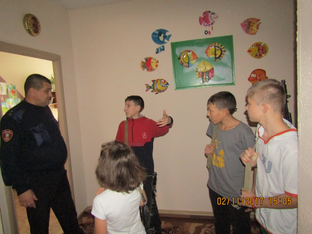 Прапорщик полиции Романенков Е.И. провёл практическую часть профориентационной направленности «Тактические учения». Объясняя правила поведения при захвате здания Евгений Иванович объяснил детям как правильно оценить обстановку для того, чтобы сохранить жизнь себе и окружающим. С детьми были проведена практическая отработка навыков поведения при обнаружении взрывчатых веществ, имитация действий специальных подразделений войск Национальной гвардии при освобождении здания.