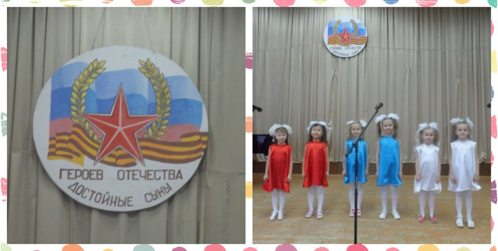 А также в этот день в здании Детской Школы Искусств прошёл I муниципальный фестиваль-конкурс «Героев Отечества достойные сыны», в котором участники пробовали свои силы в трёх номинациях: «Художественное слово», «Патриотическая песня», «Хореография». Наши девочки подготовительных к школе групп, Катрюк Д, Барлыбаева С, Кустова К, Катеринкина В, Емелькина Е, Десятова А, исполнили песню «Родная моя сторона» (слова и музыка Т. Кривовой) и стали лауреатами 2-ой степени. А Катрюк Д получила ещё один диплом за участие в номинации «Художественное слово», прочитав стихотворение «У обелиска» С. Пивоварова.
