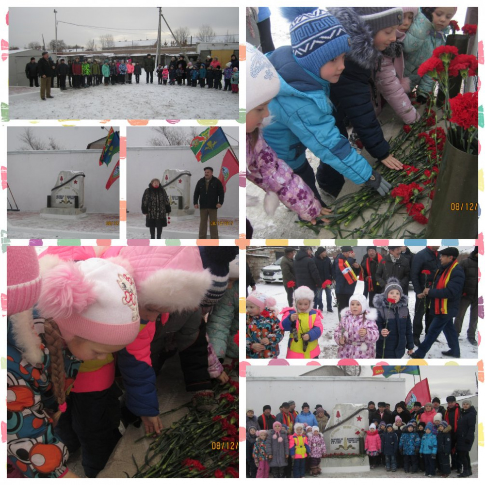 08 декабря 2017 г. дети подготовительных к школе групп присутствовали на церемонии, посвящённой Дню Героев Отечества, и возложили цветы к памятнику павших южноуральцев, которые воевали в горячих точках. На митинге выступила заместитель Главы района по социальным вопросам Макайкина С.А. А провёл мероприятие Рыжов О.Г.