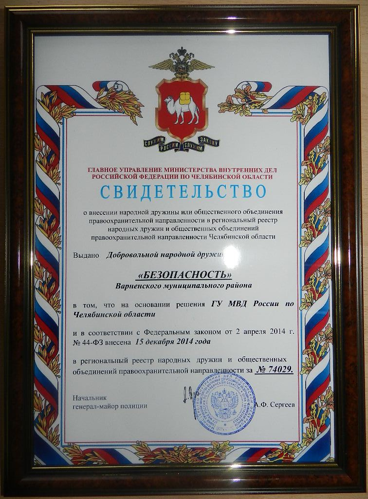 Сегодня на совещании по итогам работы за 2014 год состоялось торжественное вручение Добровольной народной дружине «Безопасность» Варненского муниципального района свидетельства о внесении в региональный реестр народных дружин и общественных объединений правоохранительной направленности Челябинской области.