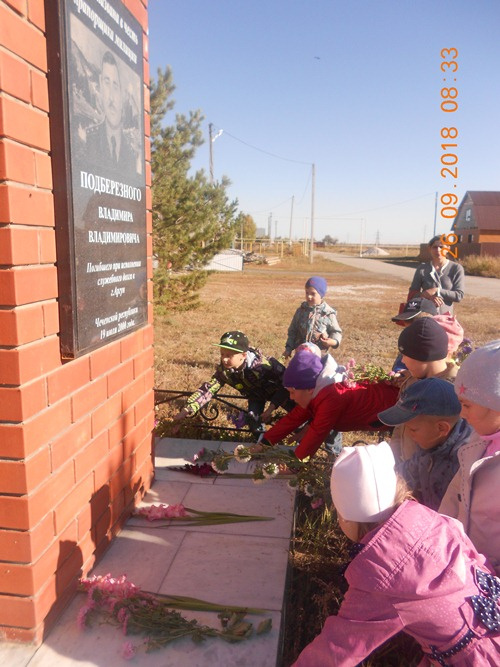 Добравшись до улицы им. В.В. Подберезного мы подошли к самой стеле. Воспитанники возложили яркие цветы, поклонились Герою, защищавшему нашу землю от бандитов, и сфотографировались на память. Затем почтили память В.В. Подберезного минутой молчания. Это мероприятие воспитывает в детях патриотические чувства, обогащает знания о Родине, знакомит с историей нашей страны, развивает чувство гордости за свой народ, за своих земляков.
