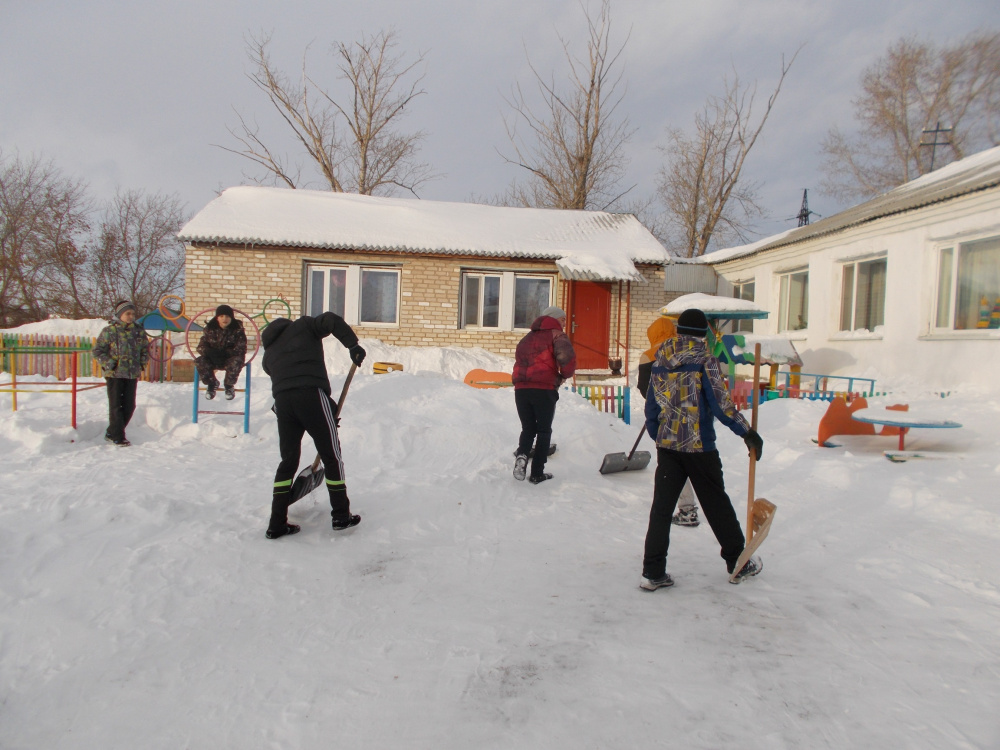 Накануне мероприятия воспитанники военно-патриотического клуба «ВАРНА» (командир Кульманов Степан) провели очистку территории детского сада от снега, подготовив площадки для прогулки детей и места проведения весёлых конкурсов.