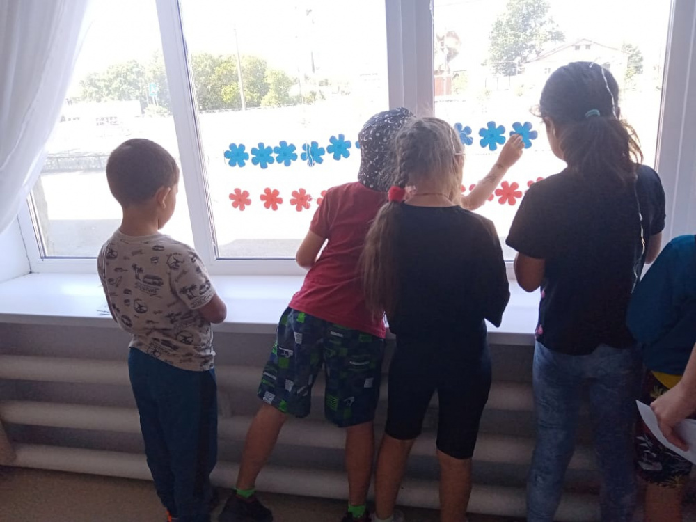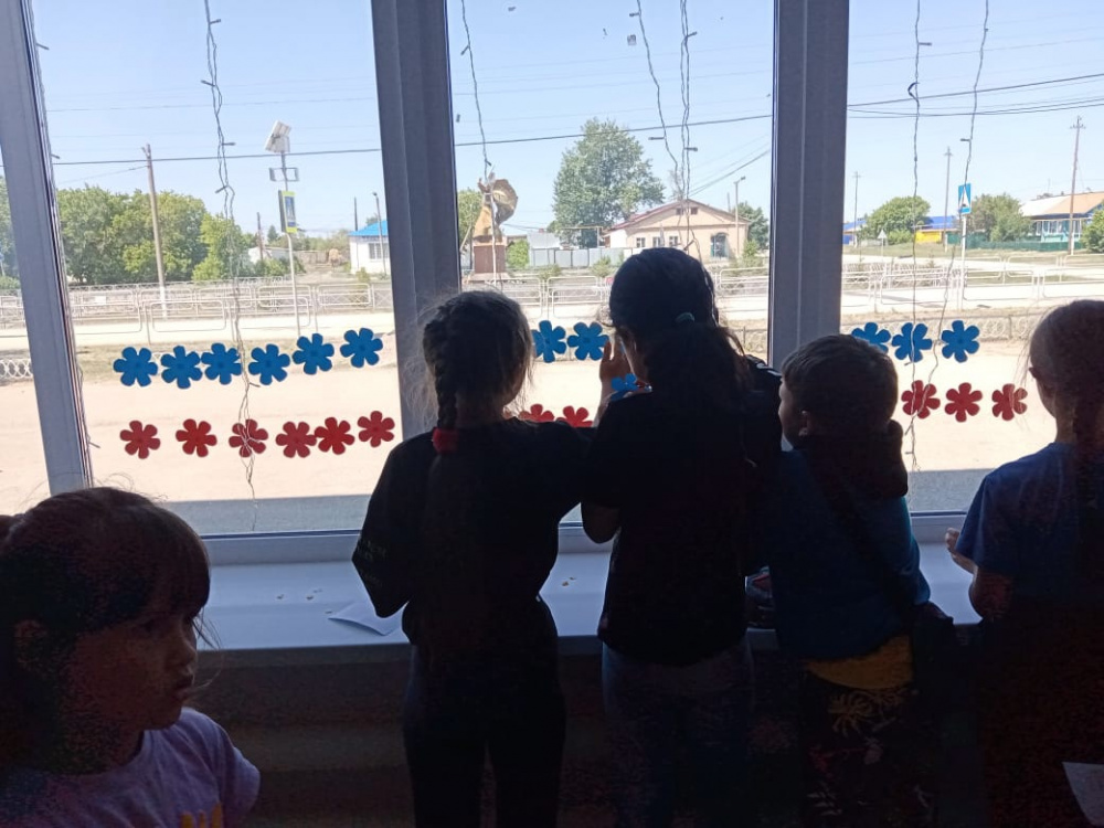Украсили окно клуба ромашками из бумаги, создав, таким образом флаг России.