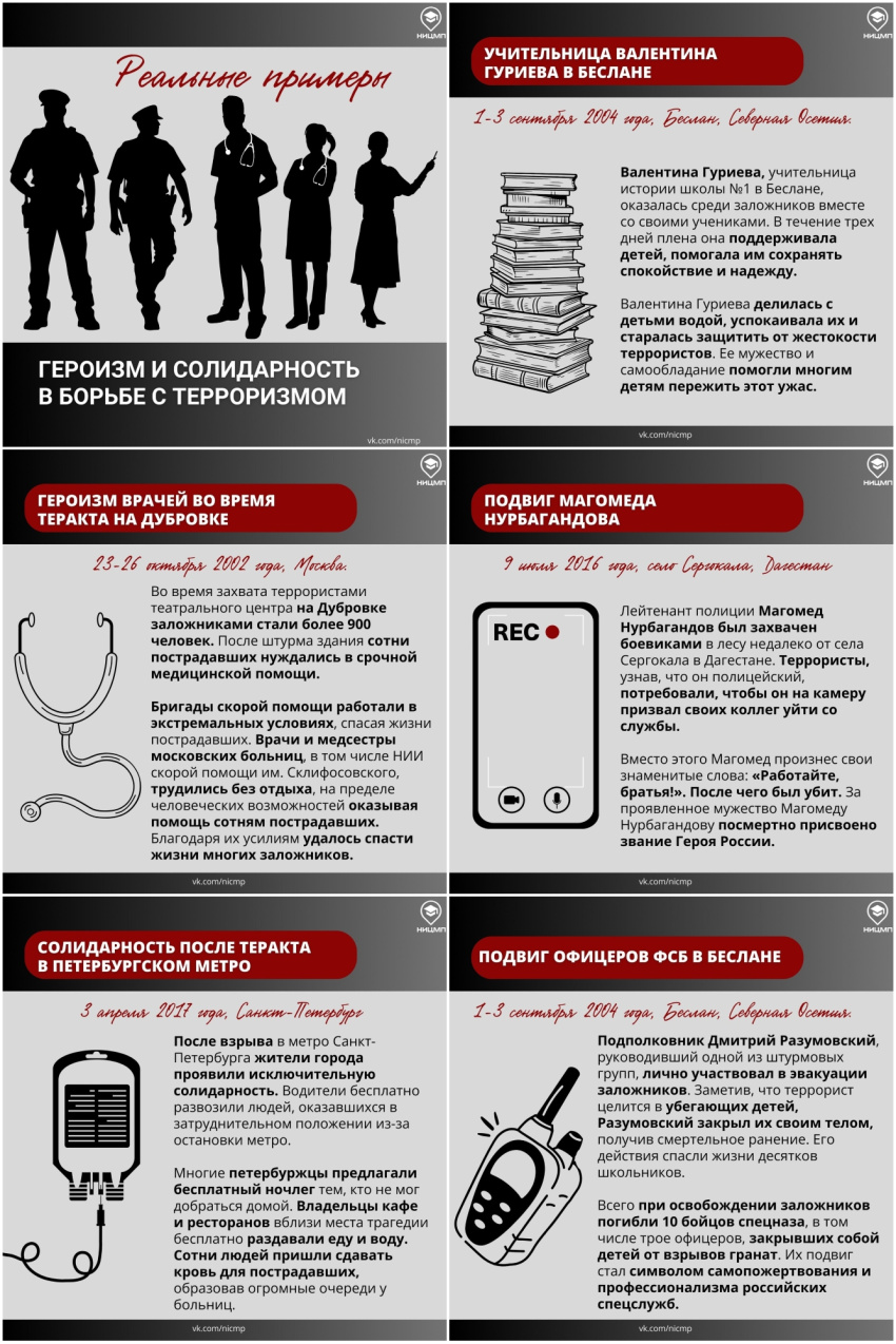 В специальных карточках специалисты НИЦ Мониторинга и профилактики (https://vk.com/wall-205543978_3221) представляет истории о мужестве сотрудников спецслужб, самоотверженности врачей, стойкости учителей и солидарности простых граждан.