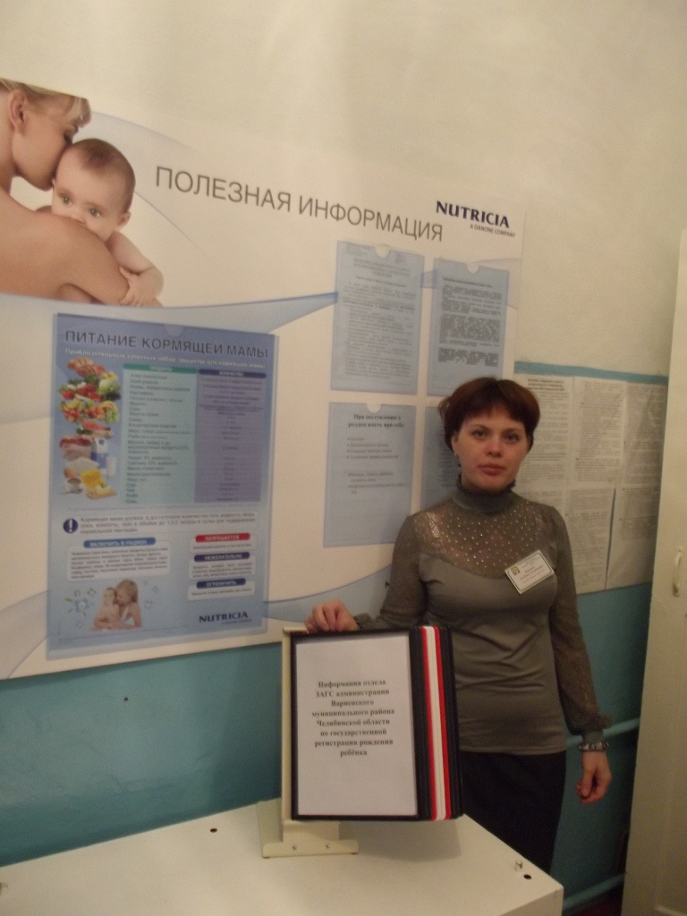 Отделом ЗАГС администрации Варненского муниципального района проводятся мероприятия по торжественному вручению свидетельств о рождении в родильном отделении. В родильном отделении нами размещена информация о регламенте работы отдела ЗАГС, перечень документов необходимых для государственной регистрации рождения ребенка, сведения о пособиях и льготах, образцы заполнения заявлений, график приема граждан отделением УФМС России в Варненском районе, график приёма граждан Социальной защиты населения.