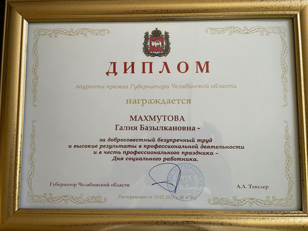 Среди них Махмутова Галия Базылкановна – начальник отдела семьи и детских пособий Управления социальной защиты населения Варненского муниципального района, удостоена Диплома премии губернатора Челябинской области.