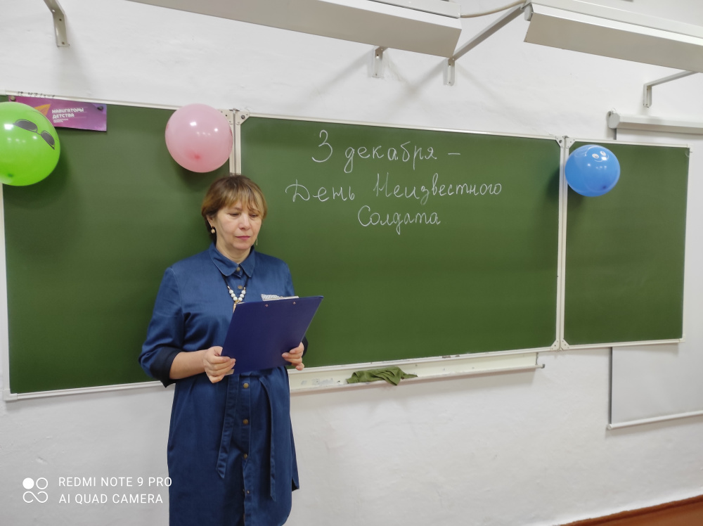 5 ноября 2014 года Президент России В.Путин подписал закон об установлении 3 декабря в России новой памятной даты - дня Неизвестного солдата. Для учащихся МОУ СОШ на уроке «Поговорим о главном» сотрудники Новопокровского Дома культуры рассказали, что послужило к установлению этот дня. Ребята слушали очень внимательно и на вопрос, что можете сделать вы, чтобы не забывать «Неизвестных солдат», ответили, что уже многие учащиеся нашей школы принимали участие в поисковых экспедициях, ухаживают за памятником, который находится в центре села, узнают о родственниках погибших во время Великой Отечественной войны.