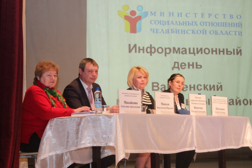 В рамках проведения информационного дня Министром социальных отношений Челябинской области Никитиной Татьяной Евгеньевной был озвучен доклад о мерах социальной поддержки граждан льготных категорий населения, оказываемых как на всей территории Челябинской области, так и в Варненском районе в частности, а также о перспективах развития системы социальной защиты области.
