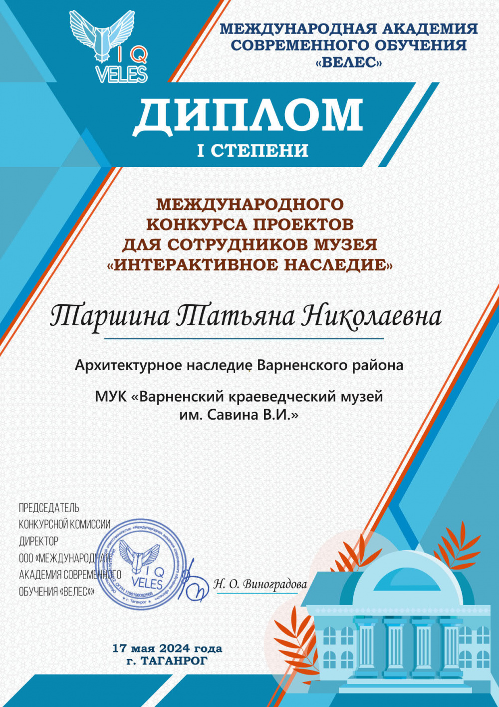 Данный конкурс проводился ООО Международной академии современного обучения «Велес» в апреле - мае месяце 2024 года. На конкурс было представлено много интересных программ и проектов на тему «Интерактивное наследие». Сотрудники «Варненского краеведческого музея им. Савина В.И.» с целью повышения профессионального уровня и обмена опытом приняли участие в этом престижном конкурсе с методической разработкой «Архитектурное наследие Варненского района», которая была очень высоко оценена конкурсной комиссией, получив Диплом победителя I степени Международного конкурса 17 мая 2024 года.