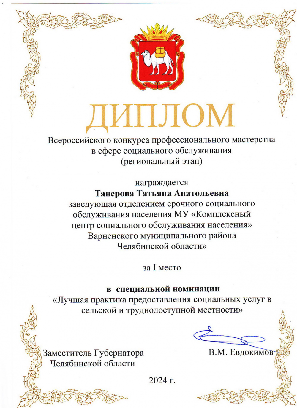 В номинации «Лучшая практика предоставления социальных услуг в сельской и труднодоступной местности» победителем стала Татьяна Анатольевна Танерова, заведующая отделением срочного социального обслуживания населения муниципального учреждения «Комплексный центр социального обслуживания» Варненского муниципального района Челябинской области.