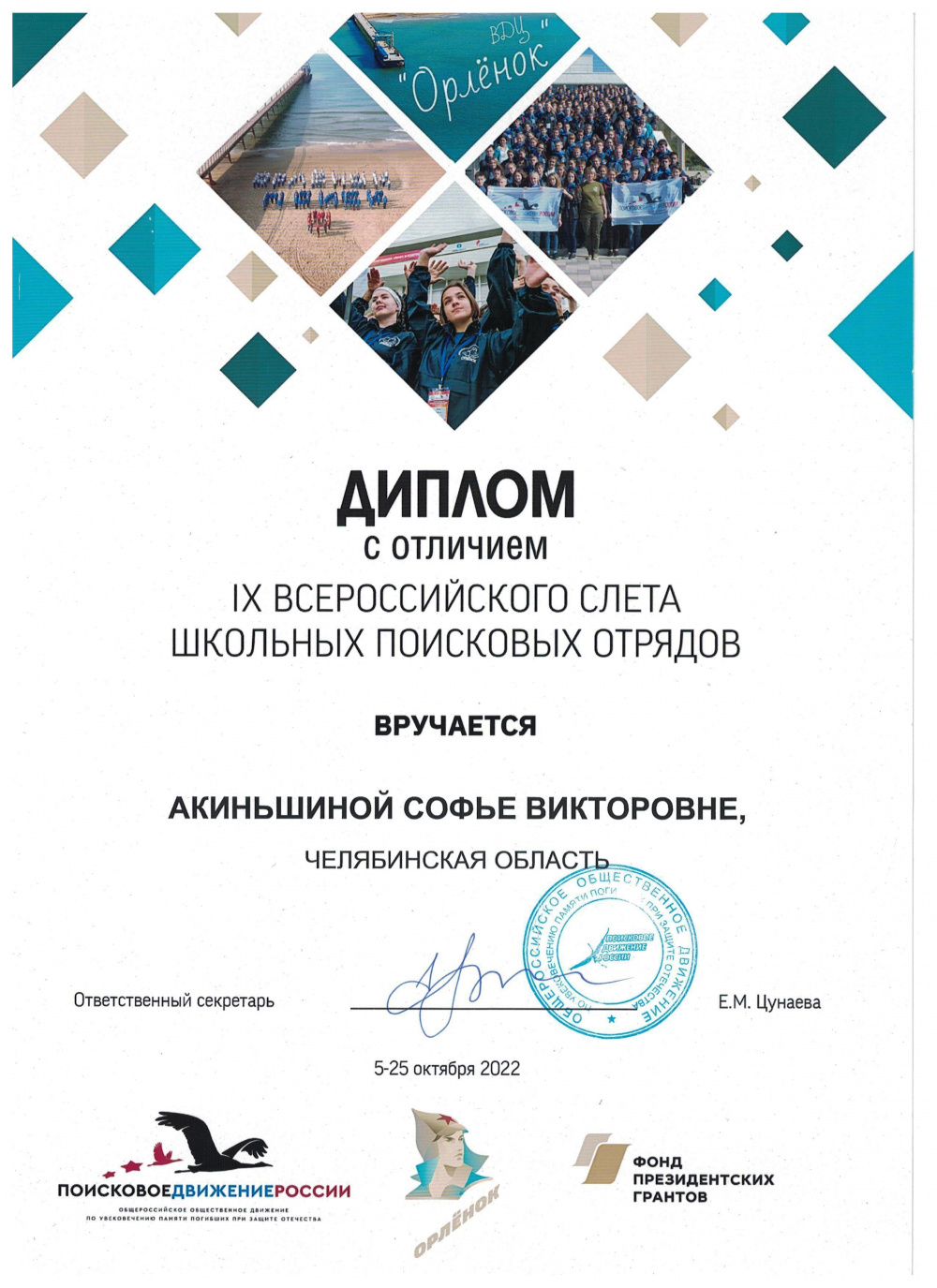 Представители поискового отряда «ВАРНА.ПОИСК» Акиньшина Софья и Акиньшин Григорий достойно представили Челябинскую область на Всероссийском слёте школьных поисковых отрядов, который проходил с 5 по 25 октября на базе Всероссийского молодёжного центра «Орлёнок».
